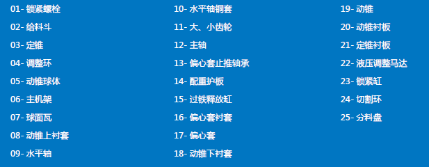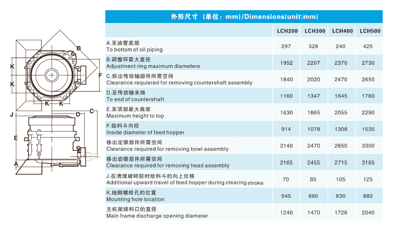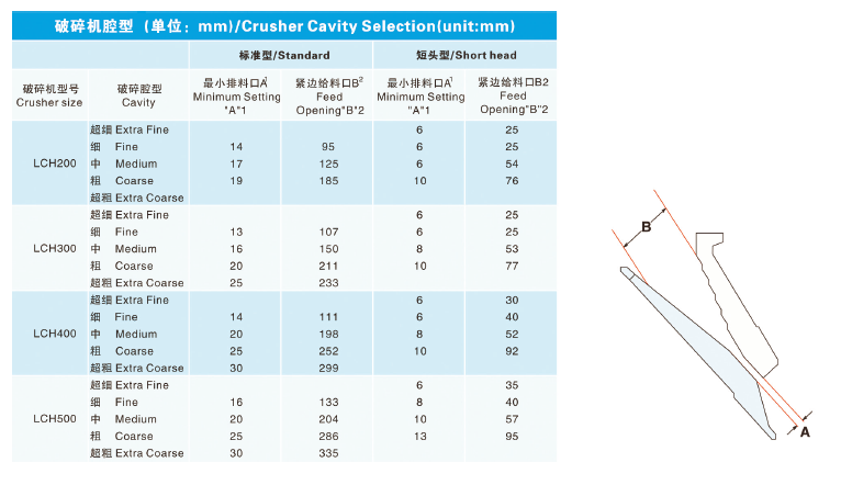 LCH 系列圓錐破碎機(jī)只需更換定錐襯板、動錐襯板、適配環(huán)和楔塊螺栓,即可將破碎腔型在短頭超細(xì)到標(biāo)準(zhǔn)超粗之間任意轉(zhuǎn)換。